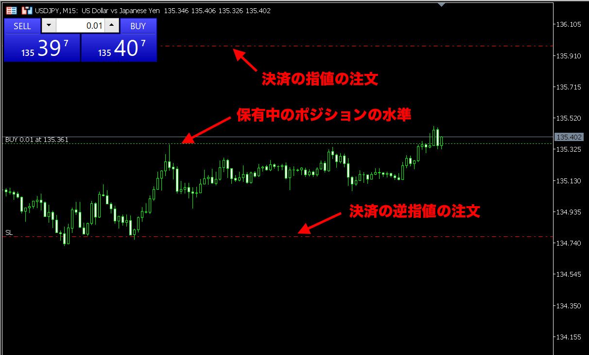 MT5はチャート上に保有中のポジション、付随する決済注文、また注文中の指値、逆指値、それに付随する決済注文の水準をチャート上に表示することができます。