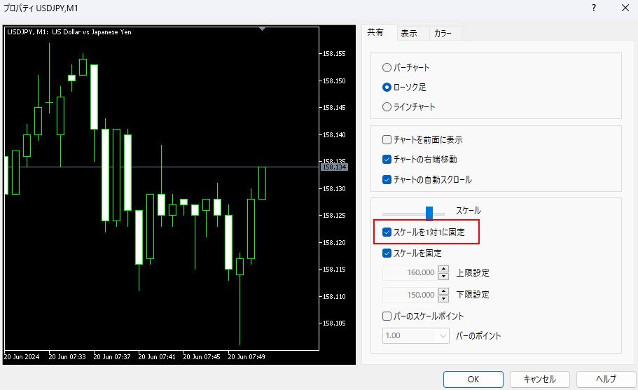「プロパティ」画面の「共有」タブ内のスケールを1対1に固定にチェックを入れるとチャートの横軸(時間)と縦軸(価格)が1対1の比率で固定されます。