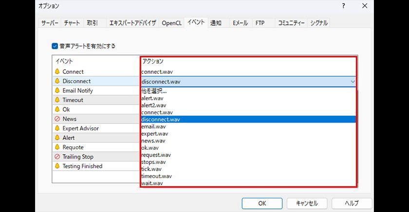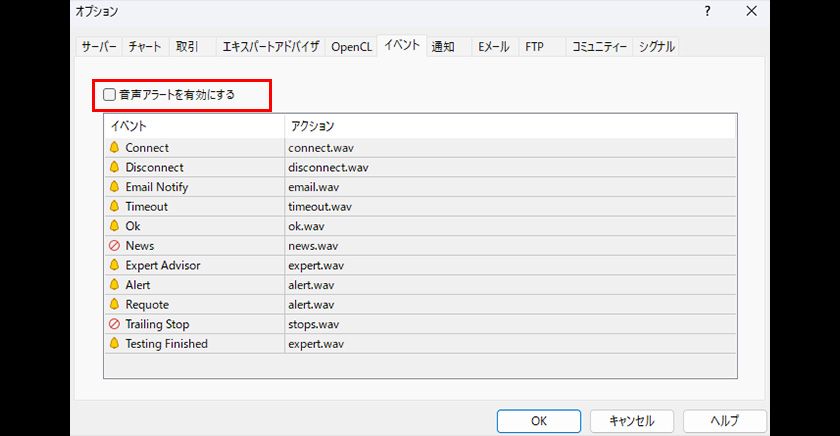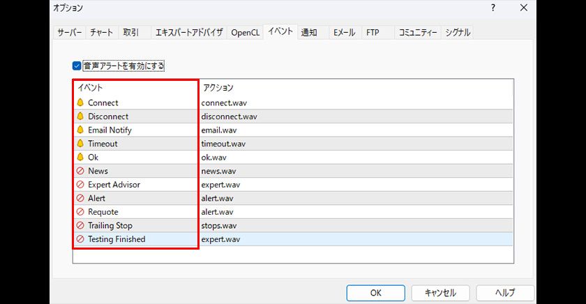 個々のサウンドを停止する場合は、「音声アラートを有効にする」のチェックボックスにチェックが入っている状態で、イベントの列をダブルクリックすると、ON、OFFを切り替えることができます。