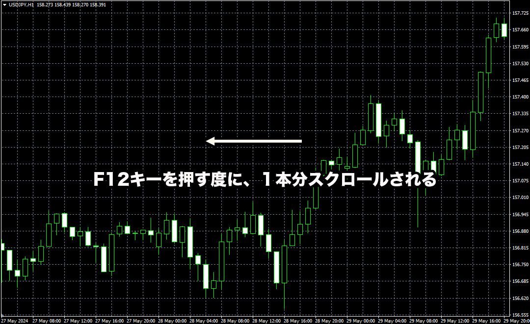 MT5のチャートは、過去のデータから新しいデータへ向けて、1本ずつスクロールすること(ステップバイステップ)ができます。過去の値動きを元にシミュレーションするときなどに便利な機能です。