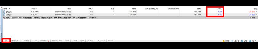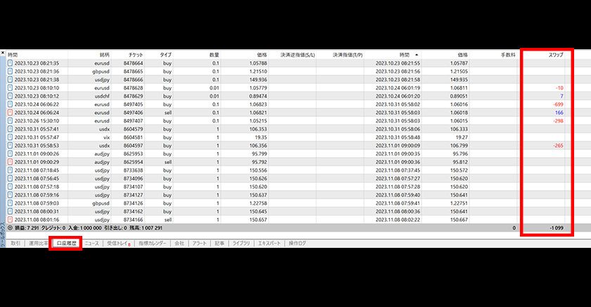 お取引で発生したスワップポイントは、MT5上で確認できます。