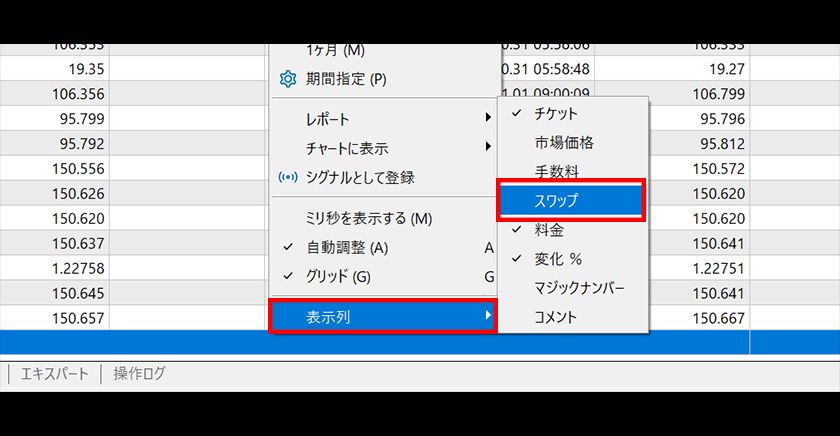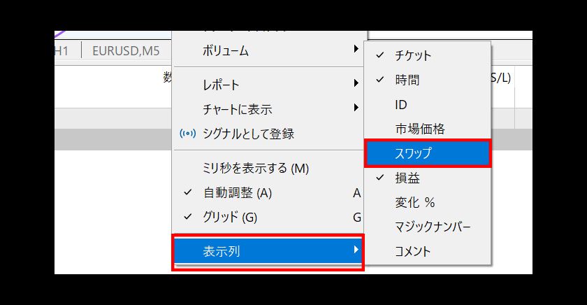 「スワップ」の項目が表示されていない場合は、「取引」タブ内で右クリックし、表示されるメニューの「表示列」内の「スワップ」を選択すると、表示できます。