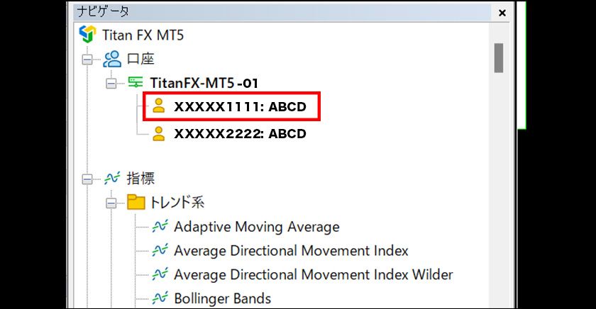 MT5のナビゲータ内の「口座」内に保存されたアカウントの一覧が表示されるので、ログインしたいアカウントをダブルクリックします。