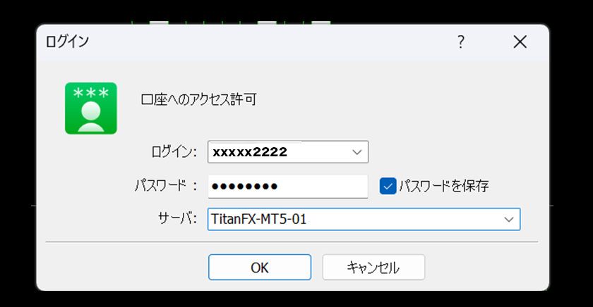 表示される「ログイン」ダイアログでログインID、パスワード、サーバにメールで送付されたログイン情報を入力し、「パスワードを保存」にチェックを入れた状態で「OK」をクリックすると、ログインが完了します。