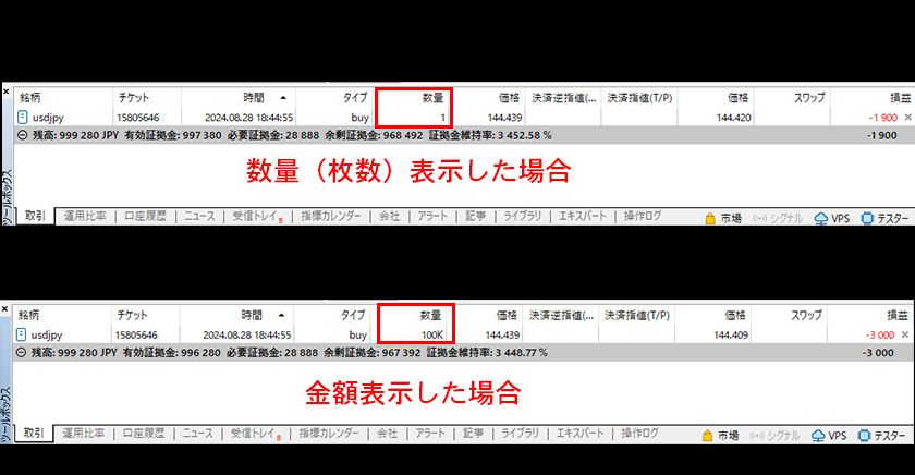 MT5のツールボックスの「取引」タブにおける取引数量の表示は、ロット数(FXの場合は、1ロット=10万通貨)か金額(FXの場合、通貨数)から選択することができます。