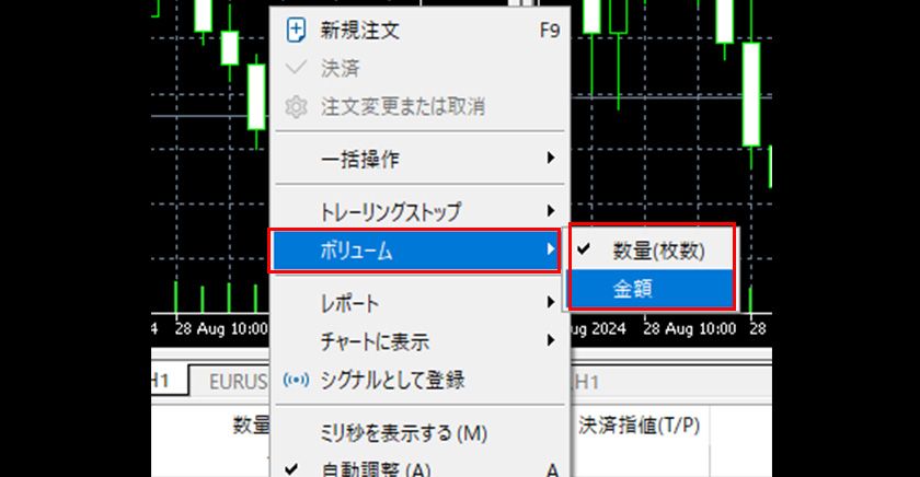 ツールボックスの「取引」タブ内で右クリックし、表示されるメニューから「ボリューム」内の「数量(枚数)」と「金額」から選択します。