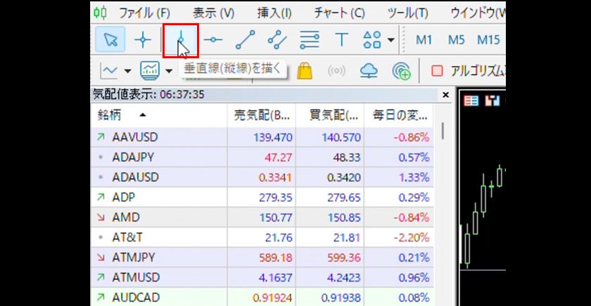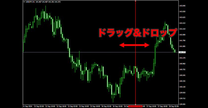 描画した垂直線上でダブルクリックし、選択した状態でドラッグ&ドロップすると垂直線を移動することができます。