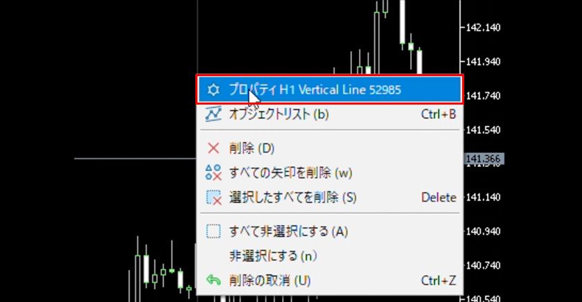 垂直線を選択した状態で右クリックし、表示されるメニューから「プロパティ 時間足 Vertical Line 番号」を選択すると、ラインのプロパティ画面が表示されます。