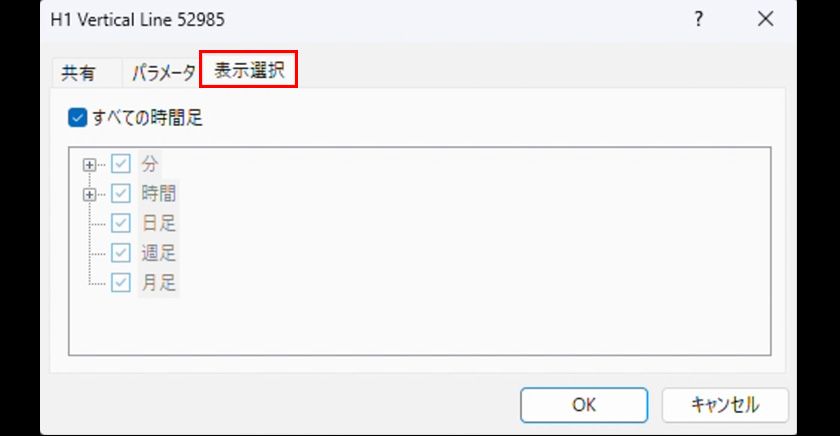 「表示選択」タブでは、垂直線を表示する時間足を指定できます。「すべての時間足に表示」のチェックボックスを外すと、チェックを入れた任意の時間足のみに表示できます。