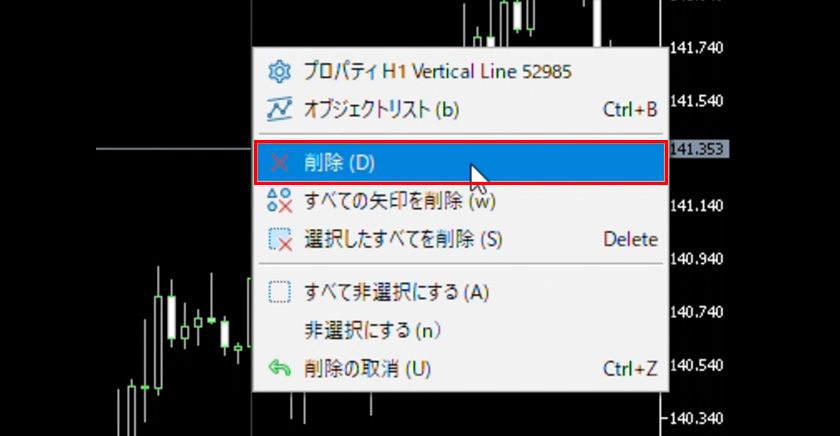 垂直線を選択した状態で右クリックし、表示されるメニューから「削除」を選択すると、垂直線を削除できます。