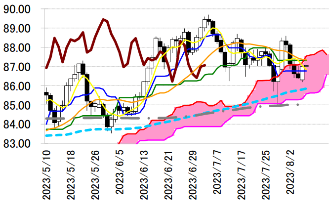 し 87.32 円に基準線、87 円半ばには 3 日高値や上昇中の雲の