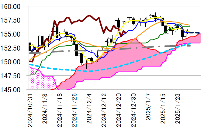 サポート1 154.49(1/28 安値、日足一目均衡表・雲の上限)