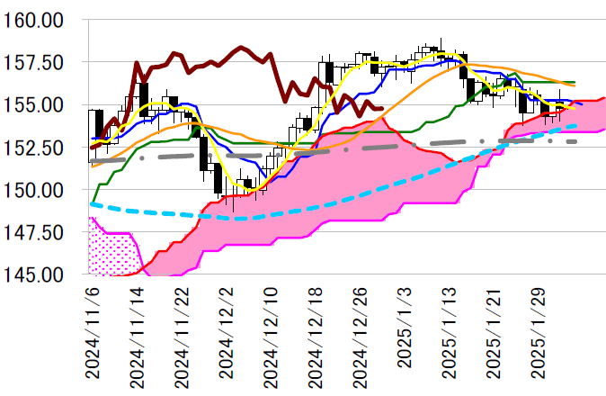 陰線引け。155 円後半まで上昇するも、1 月28 日高値の手