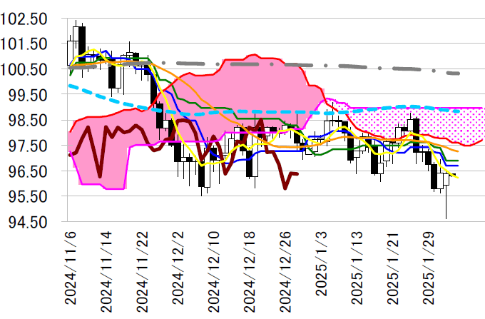 るようだと、97 円半ばの雲の下限が視野に入ってきそうだ。
