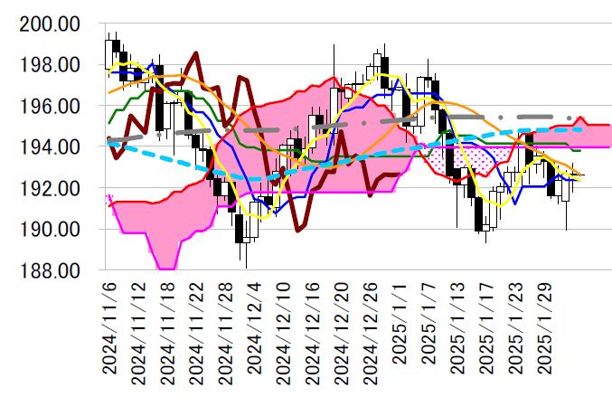 転換線は本日も192.36 円で横ばいであり、暫くは同線を