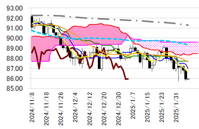 日足一目・転換線は本日87 円を下回ってきた。3 日安値