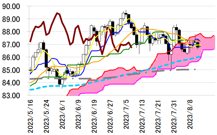 線で反落して 87 円前半の転換線や 86 円後半の基準線を下回
