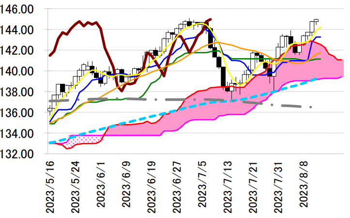を下抜けた場合は手仕舞い。なお同線は先週末高値 145 円を