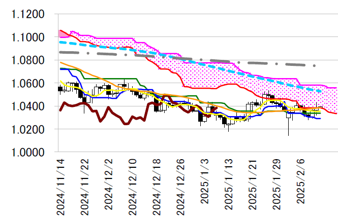 その後、トランプ米大統領が自身のSNSに「プーチン露大統領と本日、電話会談を実施し、ウクライナ での戦争を終結させるための協議を開始することで合意」「互いの国を訪問することを含め、非常に緊密 に協力することで合意」と投稿すると、ウクライナ情勢を巡る懸念が和らぎ、一時1.0430ドルまで上値 を伸ばした。