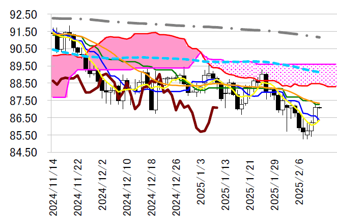 すいと見る。4 日高値87.47 円や基準線87.27 円など87 円台