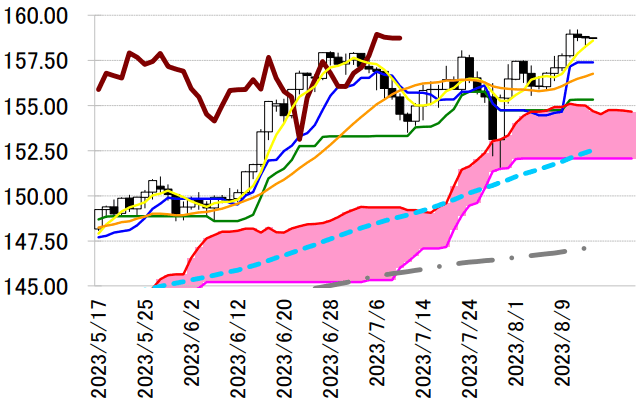 陰線引け。転換線は基準線を上回り、遅行スパンは実線を上回り、雲の上で引けていることで、三役好転の強い買いシグナルが点灯している。2 手連続陰線でも転換線を上回って引けており反発の可能性が示唆されている。 本日は 11 日につけた 2008 年以来の高値 159.22 円を意識しながらの取引か。トレンドは変わらず押し目買いスタンスで臨み、転換線を下抜けるようならば手仕舞い。