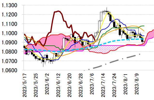 陰線引け。雲の上で引けているものの、転換線は基準線を下回り、遅行スパンは実線を下回っているため売りシグナル優勢な展開。7 月前半以来の 1.08 ドル台に突入するも、薄い一目雲の辺りでは支えられた。2 手連続陰線で転換線を下回って引けており続落の可能性が示唆され、本日は同線を抵抗水準に戻り売りスタンスで臨みたい。転換線を上抜けた場合は手仕舞い。