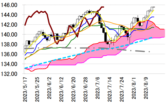 陽線引け。転換線は基準線を上回り、遅行スパンは実線を上回り、雲の上で引けていることで、三役好転の強い買いシグナルが点灯中。145 円半ばまで上昇し、昨年 11 月以来の高値をつけた。6 手連続陽線で転換線を上回って引けており、続伸の可能性が示唆されている。 本日は、14 日の安値を支持に押し目買いスタンスで臨み、同水準を下抜けた場合は手仕舞い。