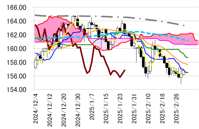 は本日157 円をやや下抜け、明日には156 円半ばまで低下見