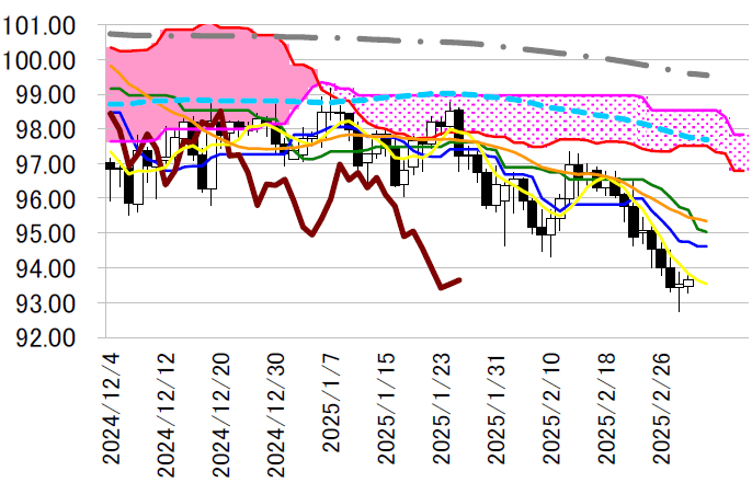 92 円後半から持ち直したが戻り幅は限られており、まだ下