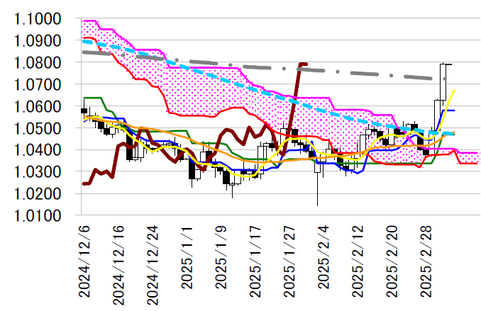 なお、24時発表の2月米ISM非製造業景況指数は53.5と予想の52.6を上回り、米長期金利は上昇に 転じたものの、ユーロドルの下押しは限定的となり、高値圏での推移が続いた。