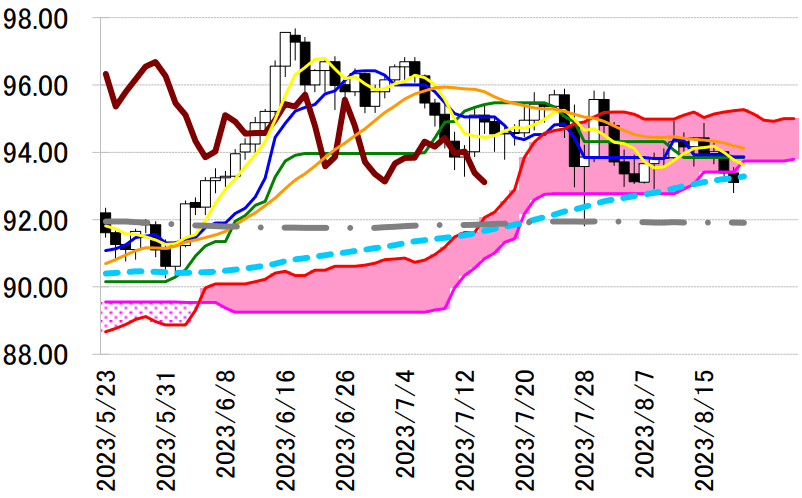 陰線引け。転換線は基準線を上回っているものの、遅行スパンは実線を下回り、雲の下で引けていることで、売りシグナルが優勢な展開となっている。2 手連続陰線で転換線を下回って引けており続落の可能性が示唆されている。本日は、転換線を抵抗に戻り売りスタンスで臨み、同線を上抜けた場合は手仕舞い。
