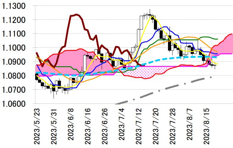 陰線引け。転換線は基準線を上回り、遅行スパンは実線を上回り、雲の上で引けていることで、三役好転の強い買いシグナルが点灯している。2 手連続陰線でも転換線を上回って引けており反発の可能性が示唆されている。本日は、18 日の安値を支持に押し目買いスタンスで臨み、同水準を下抜けた場合は手仕舞い。