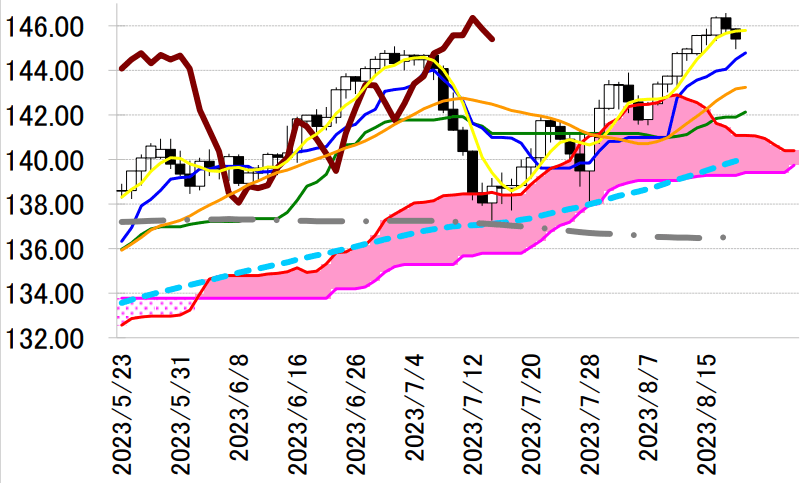 本邦通貨当局は、昨年 3 回、ボラティリティー抑制を名目にしたドル売り・円買い介入を断行したが、 円買い介入は、ボリンジャー・バンド+2σ付近で行われ、介入後の安値は日足一目均衡表・基準線付近だ った。本日の高値の目安となる+2σ水準は 147.15 円付近、安値の目安となる基準線は 142.13 円となって いる。