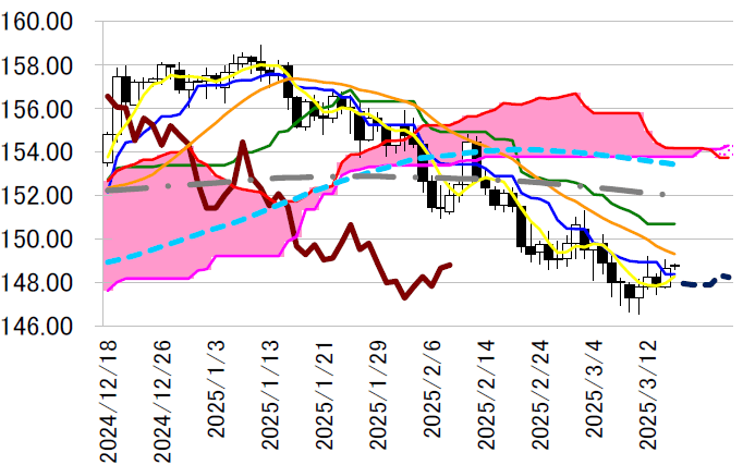 149 円半ばから前半へ低下する21 日移動平均線を上値に控