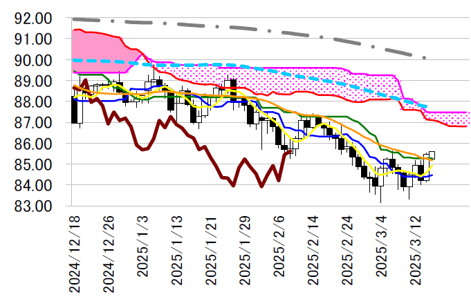 定するが、85.18 円前後で低下中の21 日移動平均線を追うよ
