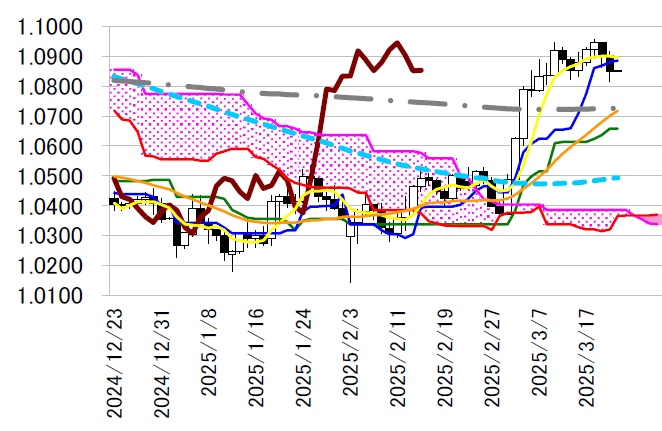 NY市場に入ってもこの流れが続いた。米政権の関税政策をきっかけとする貿易摩擦が欧州経済に悪影 響を及ぼす可能性が改めて意識されたこともユーロの重しとなり、一時1.0815ドルと日通し安値を更新 した。3月米フィラデルフィア連銀製造業景気指数や前週分の米新規失業保険申請件数が予想より強い内 容となったこともユーロ売り・ドル買いを促した。