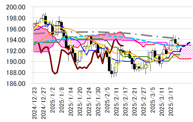 の、一目均衡表・転換線191.85 円を前に折り返す格好とな