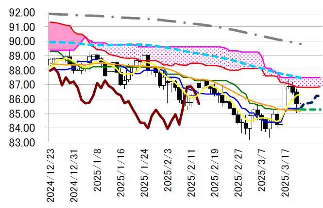 衡表・転換線85.34 円や基準線85.28 円を割り込んだ同水準