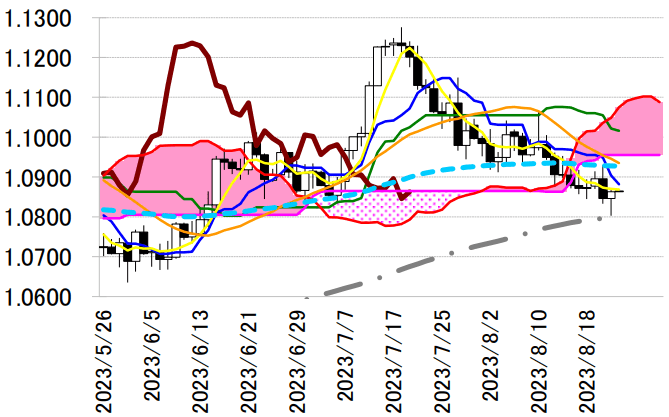 陽線引け。転換線は基準線を下回り、遅行スパンは実線を下回り、雲の下で引けていることで、三役逆転の強い売りシグナルが点灯中。孕み線で反発したものの転換線を下回って引けており反落の可能性が示唆されている。本日は、転換線 1.0882 ドルを念頭に、雲の下限を抵抗に戻り売りスタンスで臨み、同線を上抜けた場合は手仕舞い。