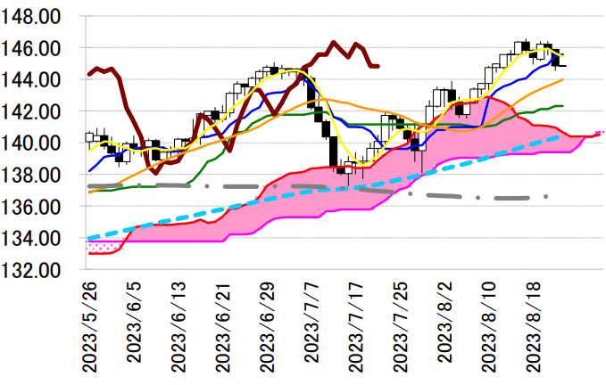 今週の最重要イベントである明日 25 日 23 時 5 分からのジャクソンホール会合でのパウエル FRB 議長の 講演では、追加利上げの是非や利下げに転じる時期に言及する可能性、すなわち米債利回りの方向性が示 唆される可能性が高いことから、144-146 円のもみ合いからの上下の放れが期待できる。