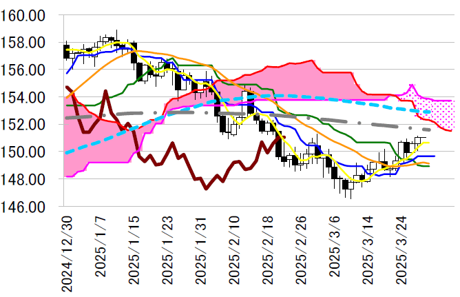 日足一目・転換線は149.60 円台だが昨日高値151.15 円を