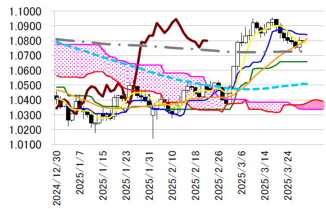 日足一目・転換線は1.0844 ドルに位置し、来週も下向き