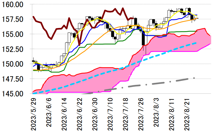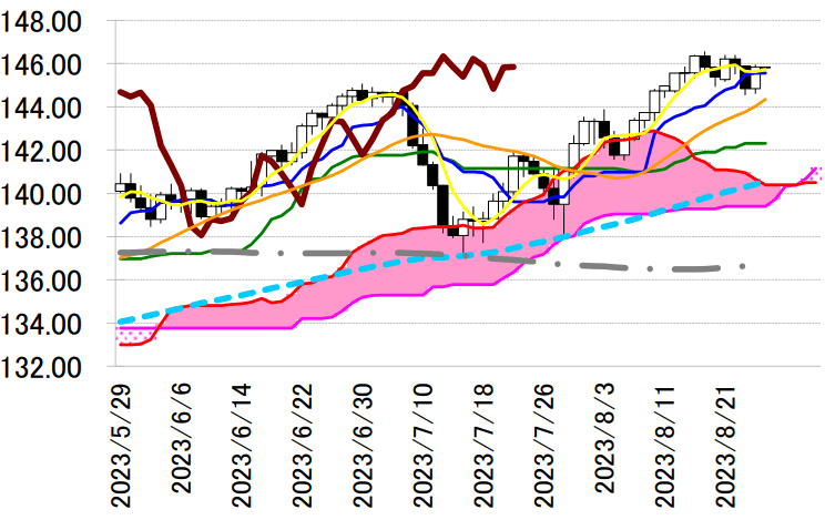 今週は、パウエル FRB 議長のジャクソンホール講演への思惑から、145 円台~146.40 円(高値)~144.54 円(安値)~145 円台で推移し、過去 9 日間の中心値である日足一目均衡表・転換線 145.55 円付近に収 斂してきている。講演内容がタカ派的ならば 147 円方向、ハト派的ならば 143 円方向、そして、曖昧なら ば、来週発表される米 7 月インフレ率や 8 月雇用統計に向けて、もみ合い相場が続くことになるのかもし れない。