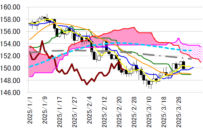 3月11日時点で過去最大規模の133902枚に膨れ上がっていたことで注目されていたIMMシカゴ筋の円 の買い持ちポジションも、25日時点では125376枚と高水準のままであり、手仕舞いのタイミングには警 戒しておきたい。円の買い持ちポジションは、ネガティブ・キャリートレードとなることで、日々コスト を払い続けるため時間との闘いとなっており、おそらく4月2日の相互関税の発動日辺りが期限ではない かと思われる。なおヘッジファンド勢は、ポジションの転換に移動平均線(50日・200日)を注視してい ると言われており、現状の水準は151.20-60円付近に位置している。