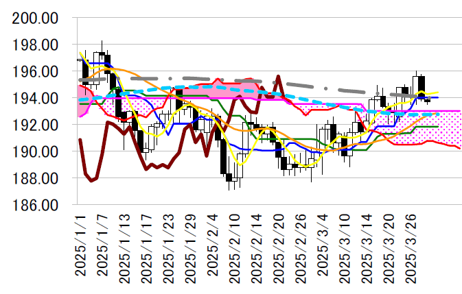 194.01 円に位置しており、両線を念頭に置いた値動きとなり