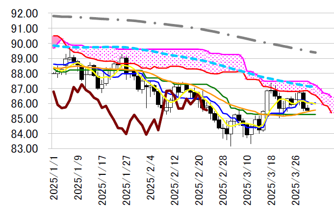 本日は転換線が86.11 円まで低下し、目先の上値めどとし