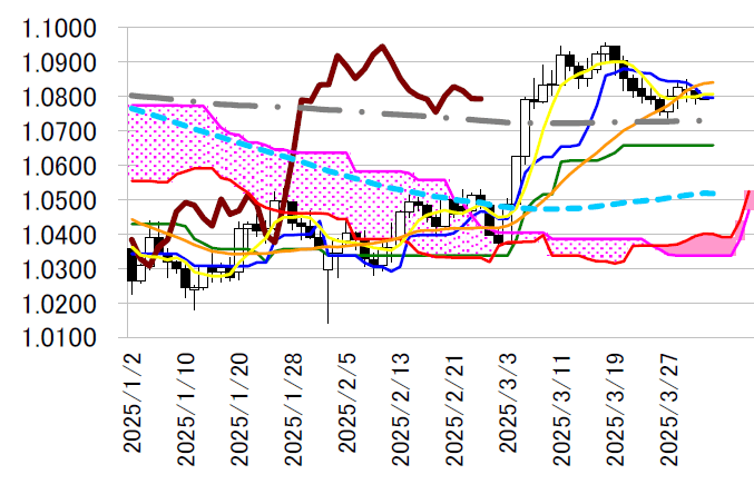 陰線引け。1.08 ドル前半に位置していた日足一目・転換線