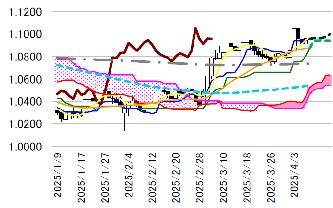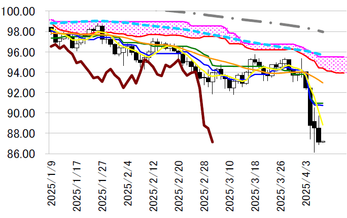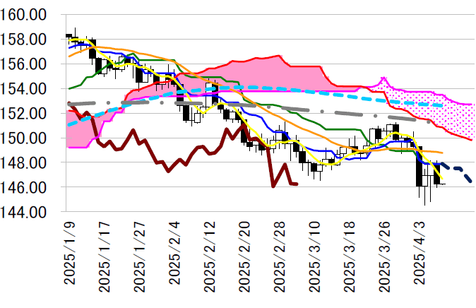 ただ、一目均衡表転換線と基準線が合わせて位置する147.89円付近がレジスタンスとして意識される と失速した。「トランプ米政権は中国に対する104%の追加関税を明日9日に発動する」と伝わると、米 中の貿易摩擦が激化するとの懸念からダウ平均が下げに転じ、一時800ドル超下落。リスク回避の円買 い・ドル売りが優勢となり、4時30分過ぎに145.97円と日通し安値を付けた。