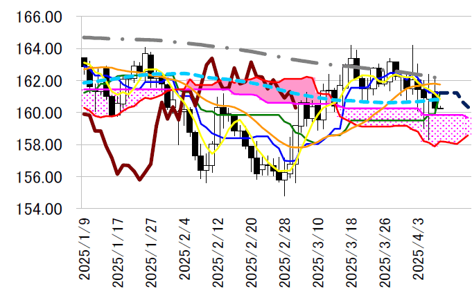 目・基準線と低下が続く見込みの転換線が推移する161 円前