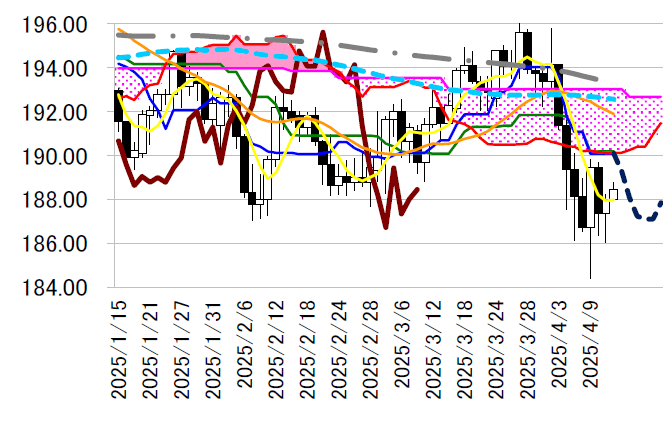 へ戻している。一目均衡表・転換線190.08 円がまだ低下余